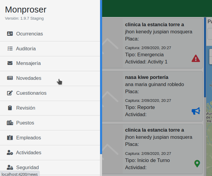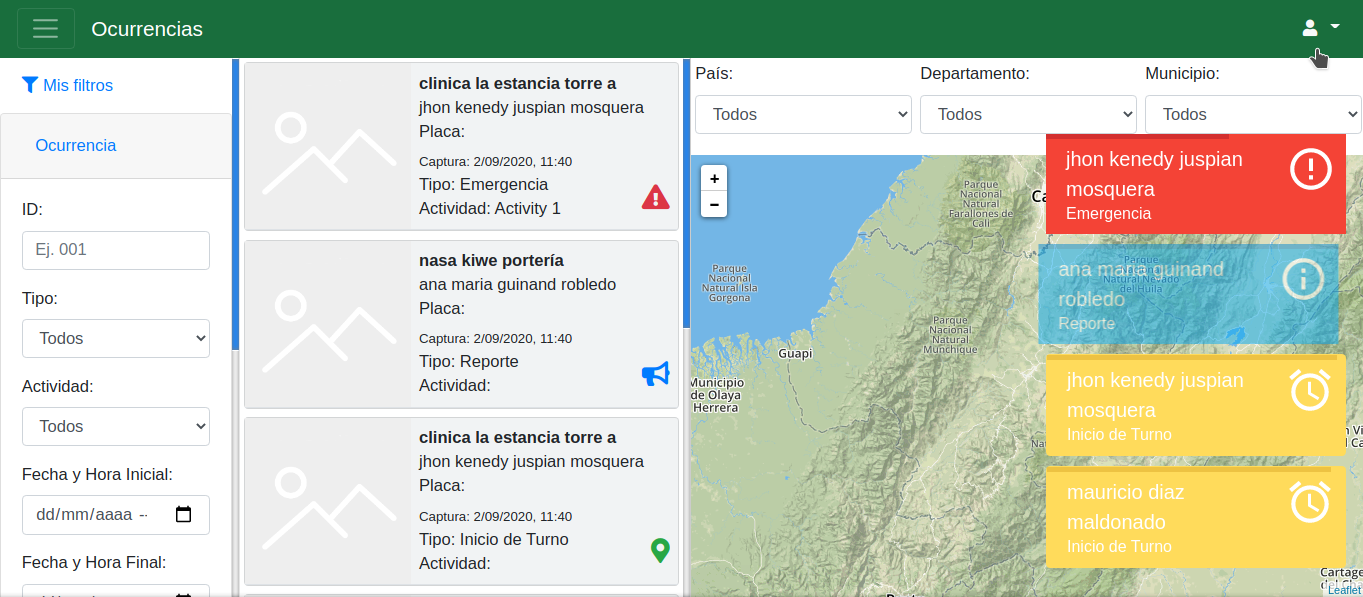 Una vez dentro del apartado ocurrencias, se listaran todas las ocurrencias registradas y al lado derecho de la pantalla se muestra un mapa con la geolocalización de cada uno de los reportes:
