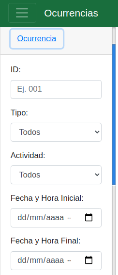1. Filtrar por datos de la ocurrencia, como lo es: id, tipo, actividad y un rango en la fecha de creación: