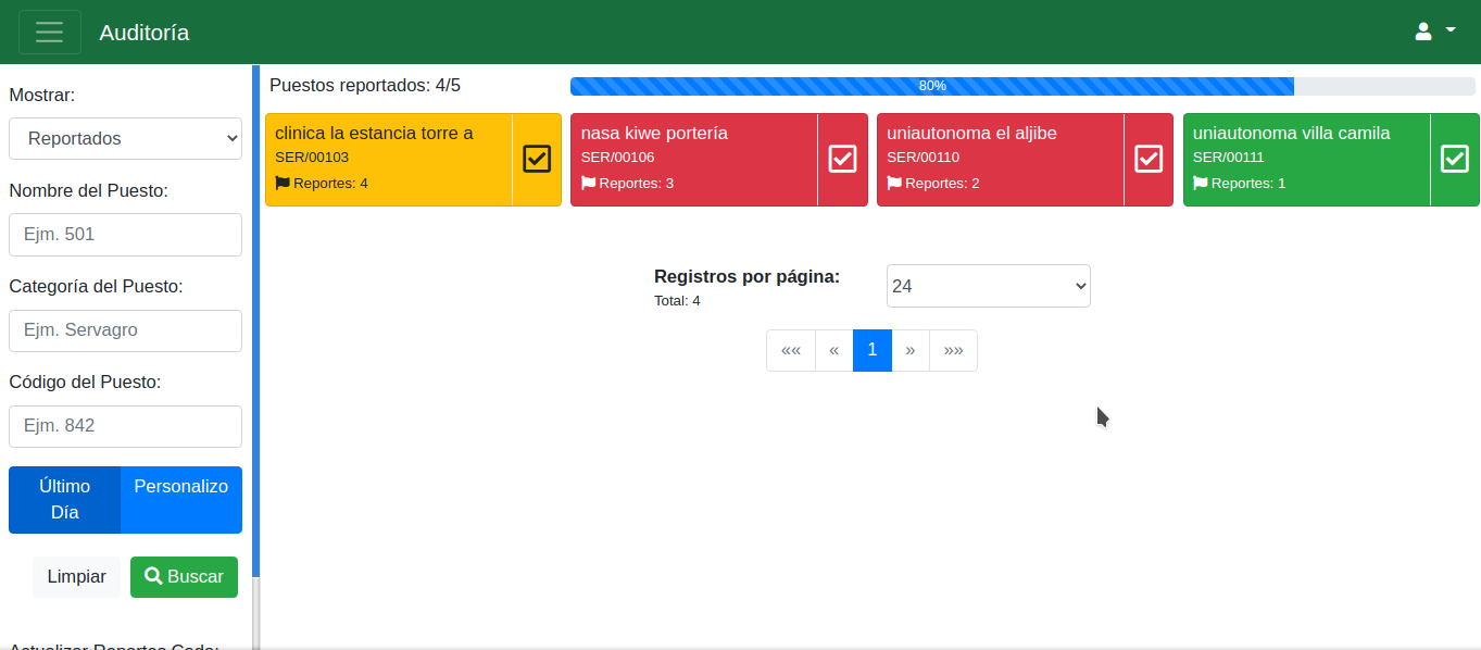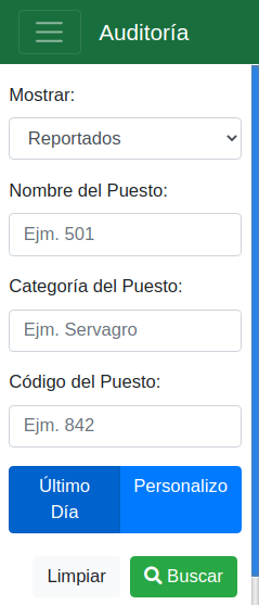 Los sitios se pueden filtrar por: Puestos reportados, Puestos no reportados, Nombre del Puesto, Categoria del Puesto, Codigo del Puesto, mostrar ultimo dia o un rango de fechas (personalizado):