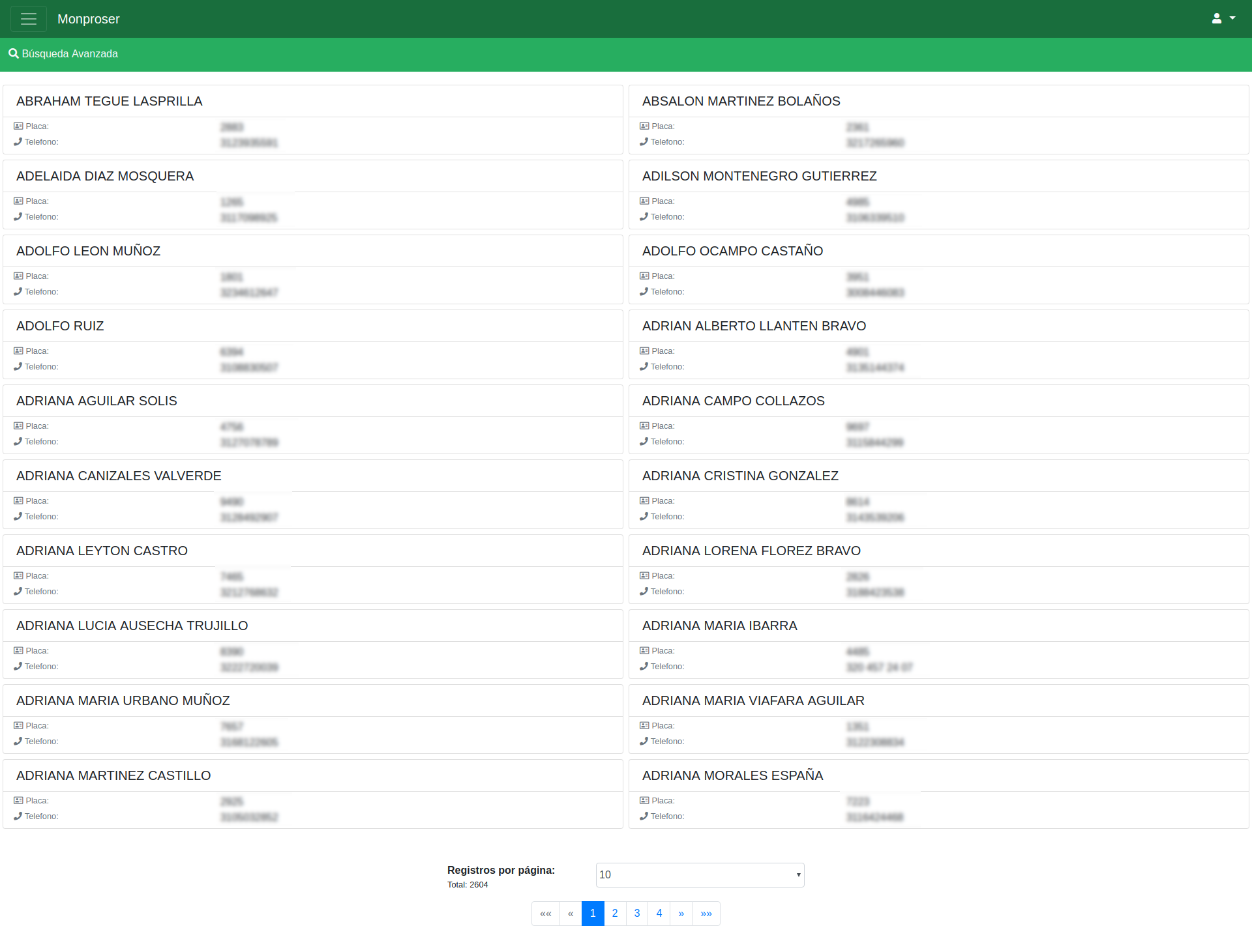 El sistema lista la información básica de los empleados como placa, teléfono, cargo, etc.