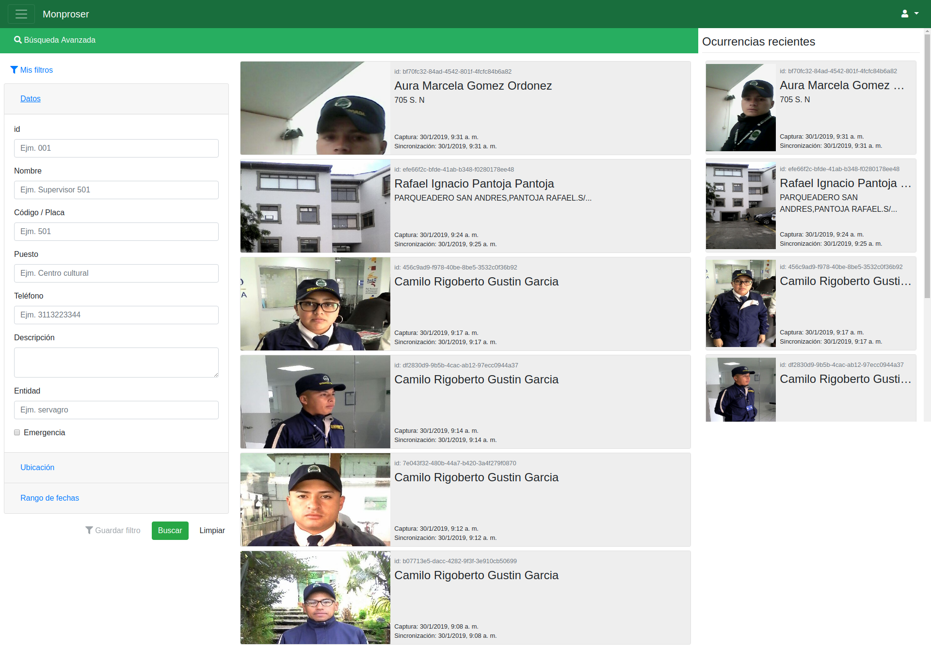 Permite visualizar los reportes realizados por el equipo de vigilantes y supervisores con la posibilidad de filtrar las ocurrencias por rango de fecha, ciudad, puesto, empleado, tipo de ocurrencia, etc. Dichas ocurrencias se notificarán al monitor tan pronto sean sincronizadas con el servidor.