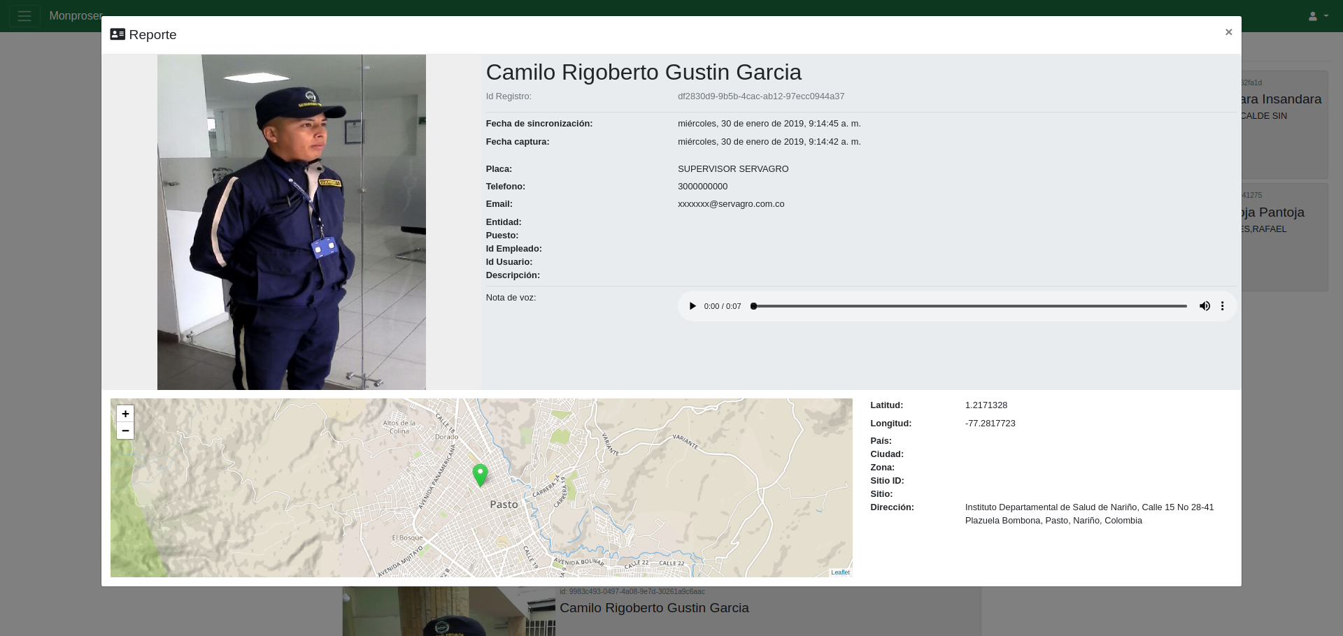 Monproser permite realizar un cronograma de reportes por medio de la georeferencia capturada por la aplicación móvil Proser. La cual utiliza el GPS del dispositivo para registrar la ubicación de los vigilantes y supervisores de acuerdo a las actividades programadas.